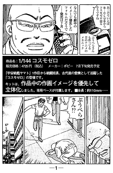 模型の国の人はご存じと思うが、簡単に言うと設定資料にある三面図でなく、劇中のフォルムを優先したコスモゼロのレジンキットがメーカーから発売されるという事である(写真参照:岩手のエス氏作成)。ネットでリリース記事を見た時にはビックリ仰天。ここで述べている“こんなコスモゼロが欲しい”という欲求が、そのままプロの原型師とメーカーの手で実現したのだった。お前が到達しようとした地点は我々が既に通過していると宣言されたに等しい。幸か不幸か、ほぼ原型が完成した後で目にしたからアフレコ漫画作成で動揺を相殺できたようなものの、製作途上に知っていたらモチベーションは一気に消し飛んだ事だろう。