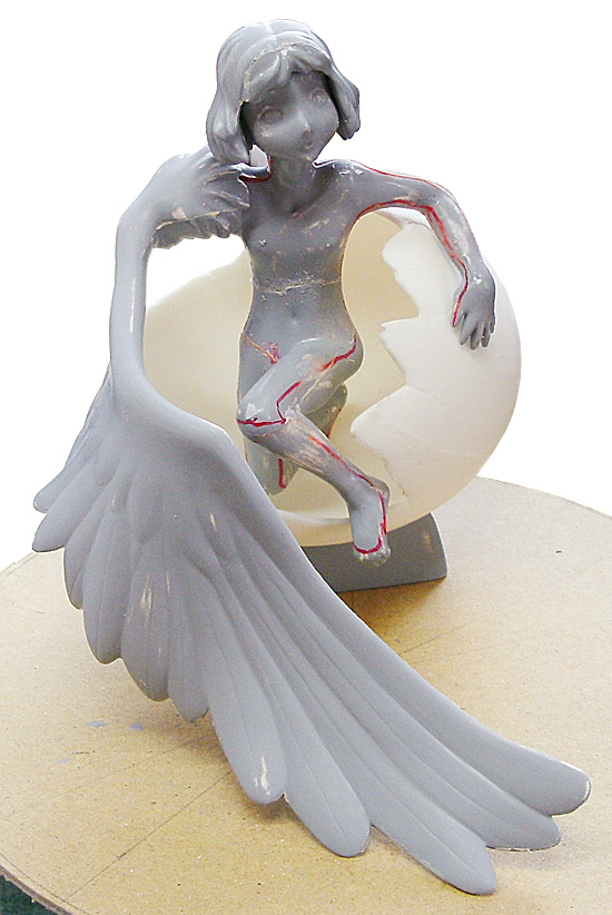 2013.9.2 mon - 10.25 fri2011年に作った「半種ちゃん」は手がけた事のないサイズでフィギュアらしいフィギュアを目指してトライしたものの元画からの再現力不足を痛感。卵と片羽の組み合わせに後ろ髪を引かれるので再トライ。スケッチ→バランス検討→設定画→粘土板からパーツ切り出し・肉盛りの通常コースで製作中。